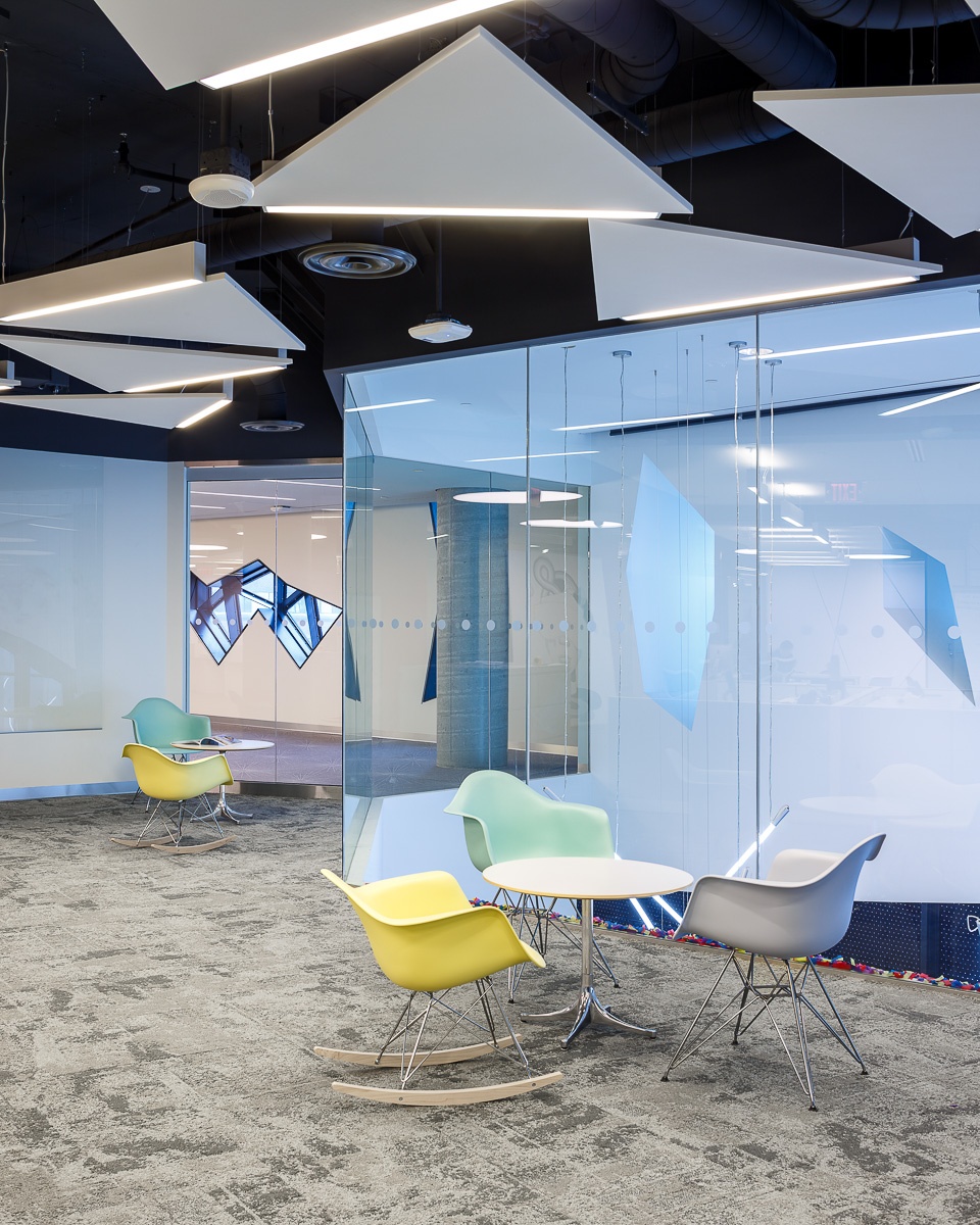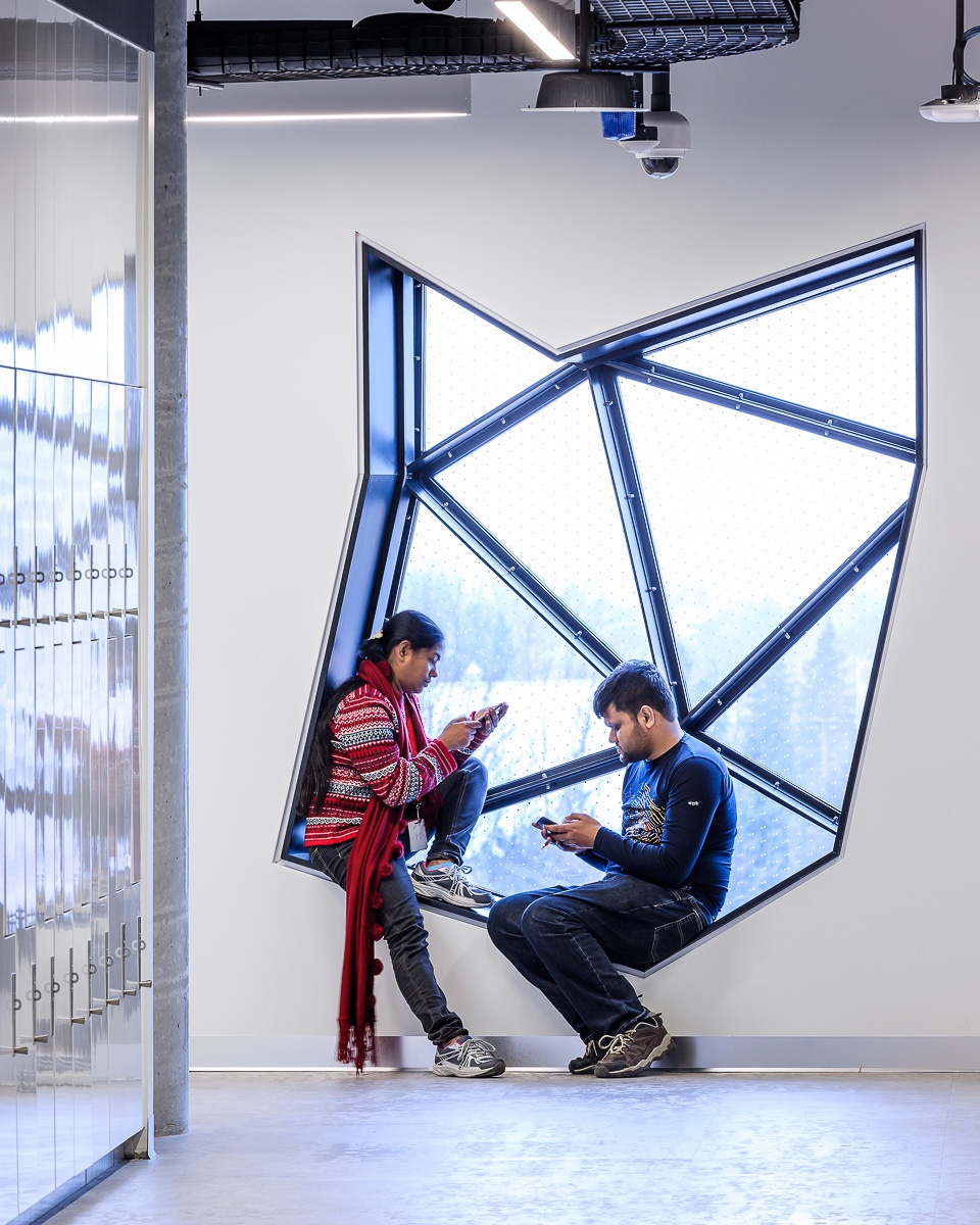 In the evenings, exterior LED fixtures have been installed with full cutoff features to shield the lighting from spilling into the night sky in an effort to reduce light pollution. Interior lighting is controlled via ceiling and wall mounted occupancy sensors which are also tied into the building automation system for after-hours shut-down. This further increases the energy savings for the project while simultaneously reducing light spillage from inside the building.