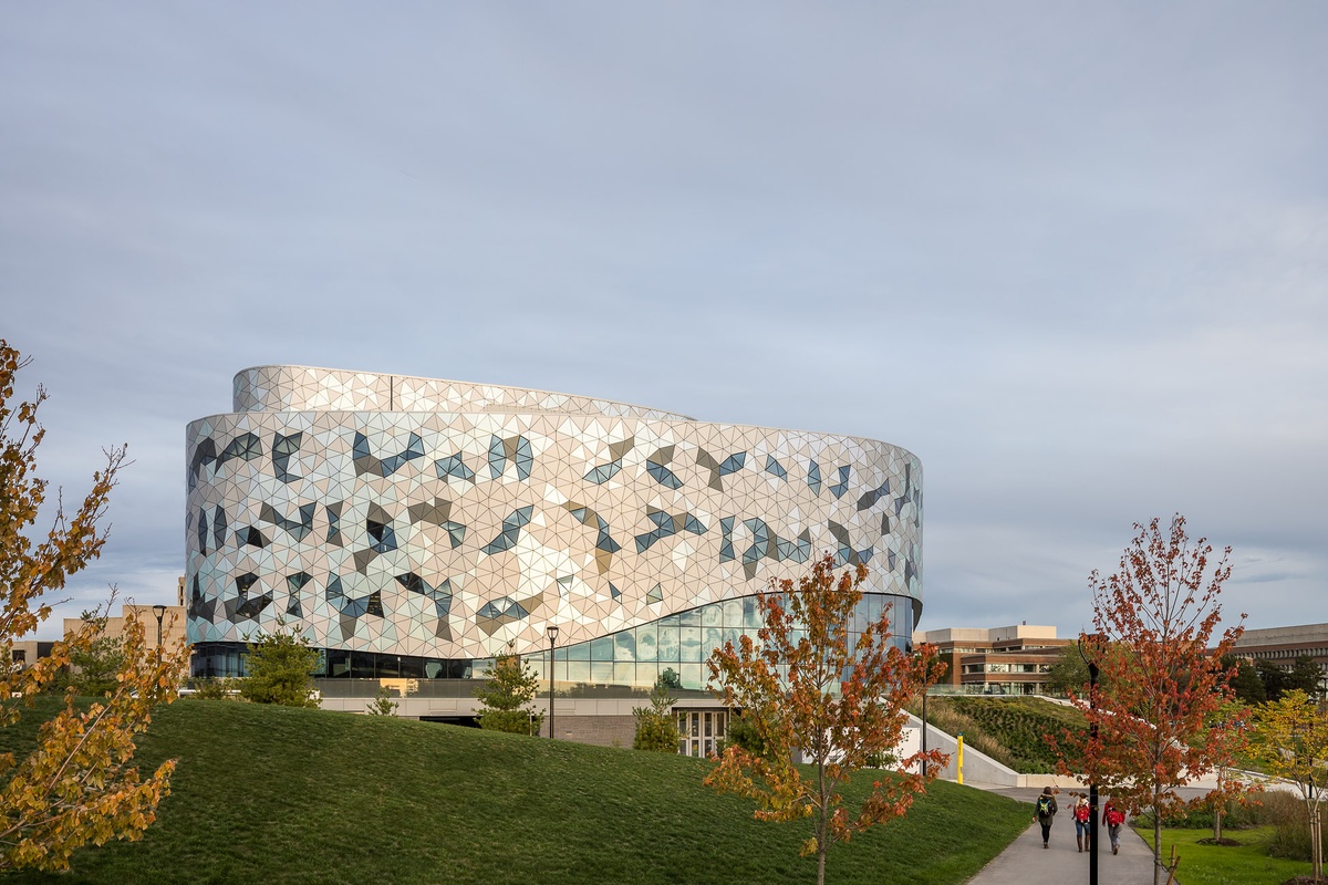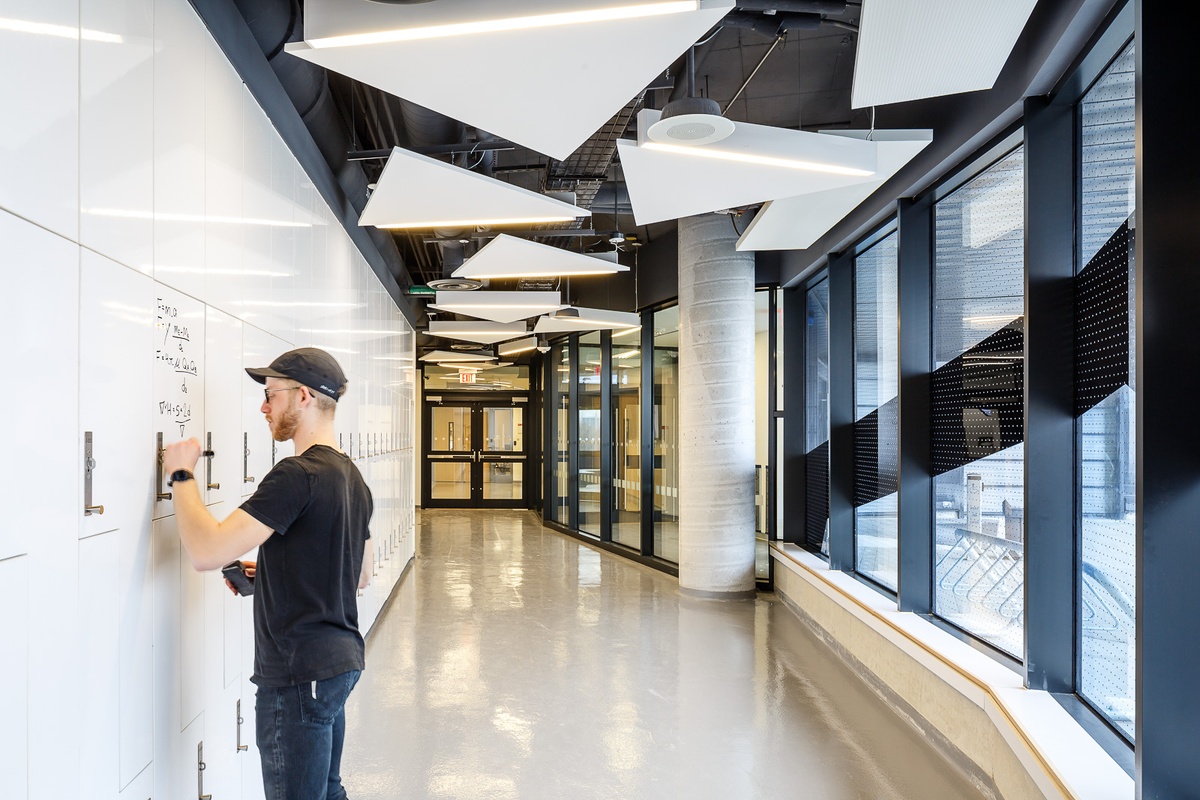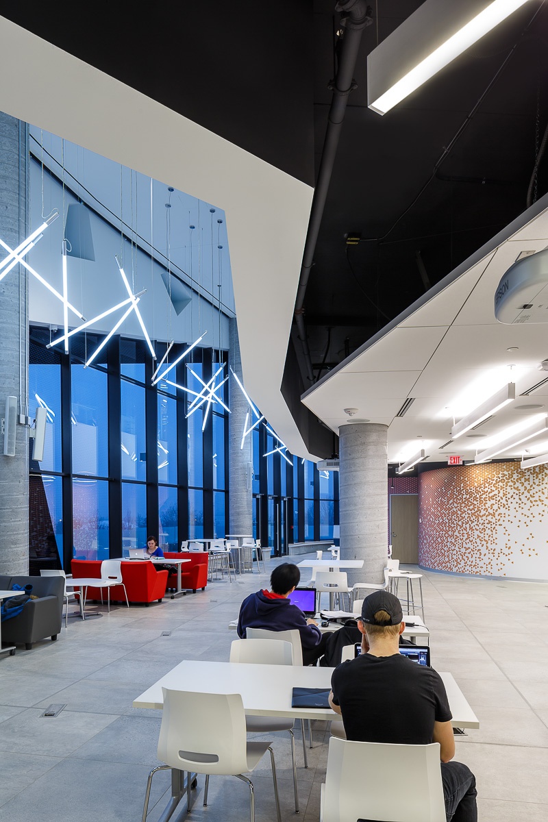 Overlooking the Stong Pond and Arboretum to the south and west, the building’s upper levels host the electrical and mechanical engineering departments, with the civil engineering program rooted on the lower levels. Student services are located at the school’s entrance with faculty administration at mid-level for optimal accessibility and engagement between faculty and students.