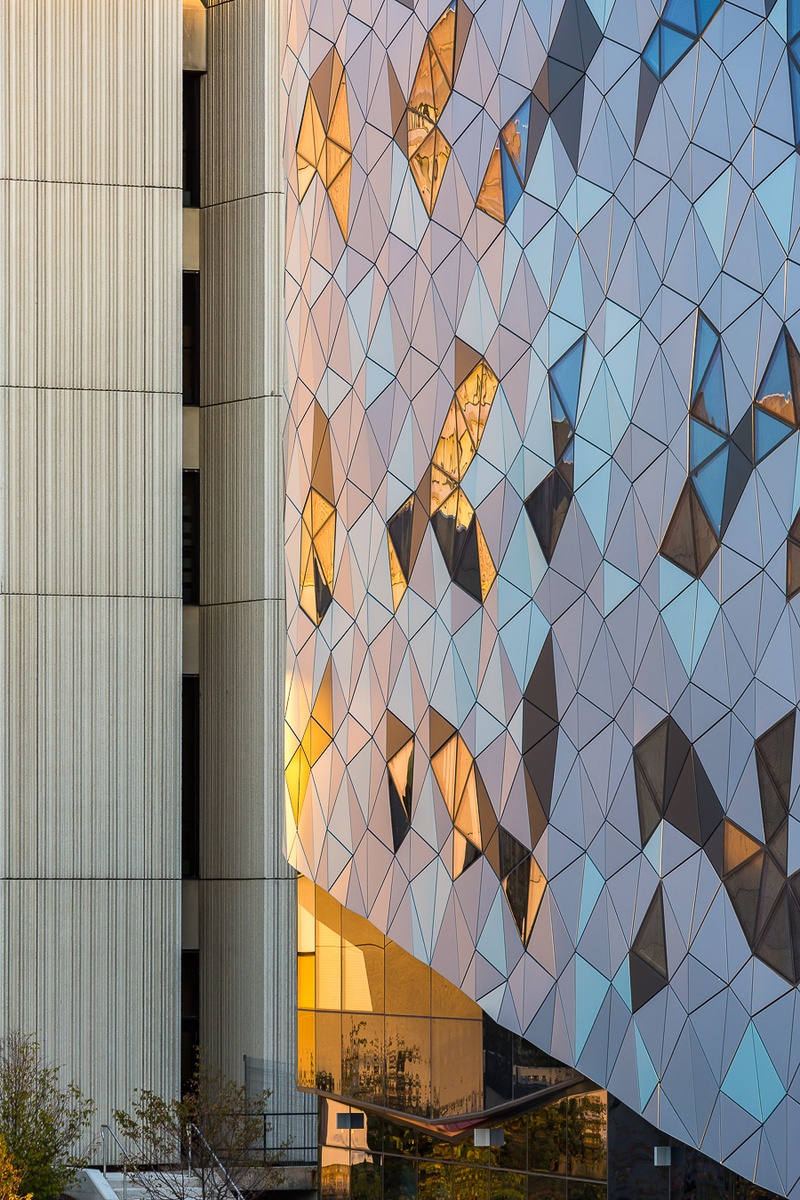 Half of the project’s roof is covered with a vegetated ‘green’ roofing system, which further assists in diminishing the rainwater peak flow rate, as the vegetation soaks up rainwater and releases it far more slowly than a conventional roof to reduce the strain on campus and municipal storm water systems. The green roof also protects the roofing system membrane from wear due to exposure of the elements and prevents the roof from excessive solar heat gain.