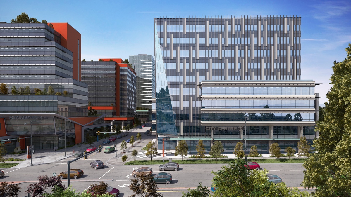 CC2 is located on a previously developed site that slopes from north to south. There is an entrance on the northeast corner of the building with a secondary entrance on the south side that opens onto a plaza-like space that is between City Centre 1 (CC1) and CC2. There are no curbs so pedestrian and vehicular traffic is differentiated by paving patterns and bollards. The surrounding neighbourhood is comprised of residential housing with a mix of single-family detached, duplexes, medium and high-density apartment buildings, and townhouses. The Green Timbers Greenway runs near the site, as does Quibble Creek.
