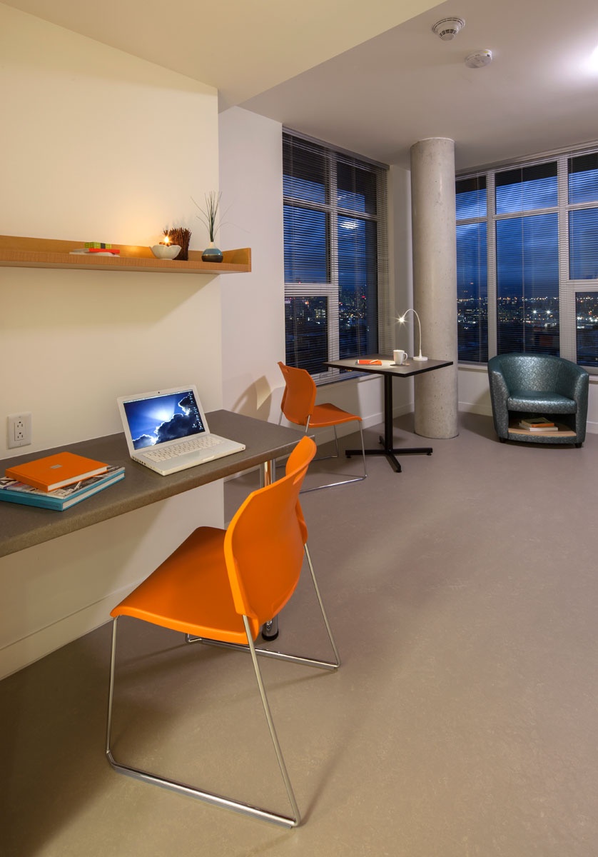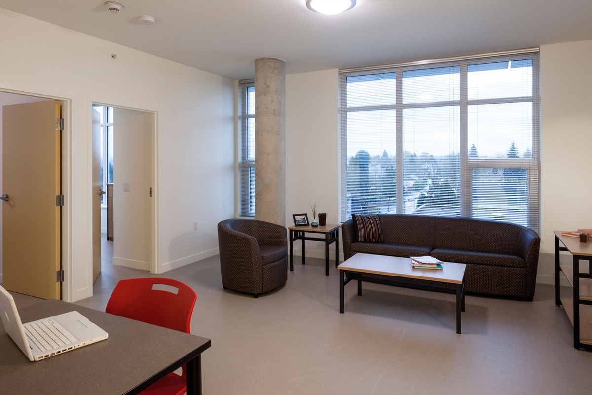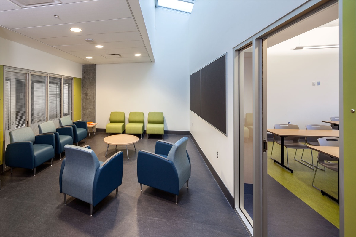 In order to make the residential suites and programming areas feel like welcoming and healthy spaces, meeting industry standards in ventilation and thermal comfort (ASHRAE Standard 62.1-2004 and ASHRAE 55 – 2004) and providing interior spaces with natural daylight was key. To safeguard Indoor Air Quality for occupants, numerous conditions were upheld during construction to reduce and prevent indoor pollutants such as Volatile Organic Compounds, and particulates from residual construction debris.
