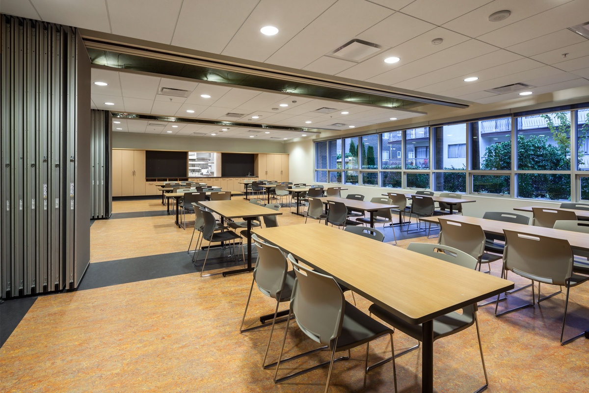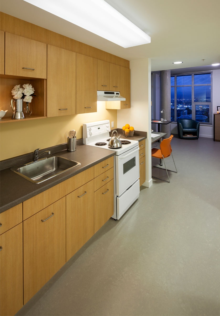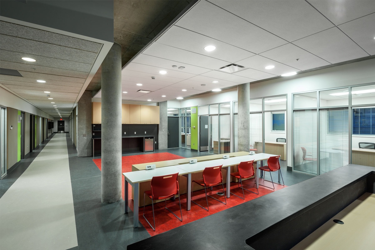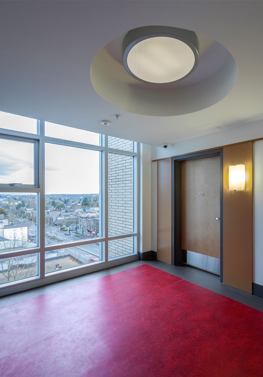 In order to make the residential suites and programming areas feel like welcoming and healthy spaces, meeting industry standards in ventilation and thermal comfort (ASHRAE Standard 62.1-2004 and ASHRAE 55 – 2004) and providing interior spaces with natural daylight was key. To safeguard Indoor Air Quality for occupants, numerous conditions were upheld during construction to reduce and prevent indoor pollutants such as Volatile Organic Compounds, and particulates from residual construction debris.