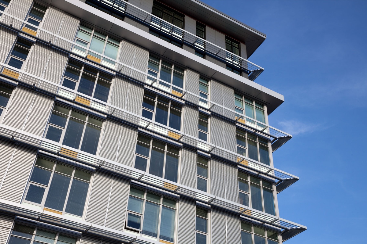 The building was designed to optimize an East-West building orientation, and to provide a large South-facing building area in a compact form. The design of the building with its separate six- and eight-storey tower forms was laid out in this way to minimize overshadowing the north-facing residential areas. The eastern and southern facing windows are protected with exterior shading, allowing the project to take advantage of winter solar gain for passive heating, while minimizing heat gain in the summer, reducing cooling needs.