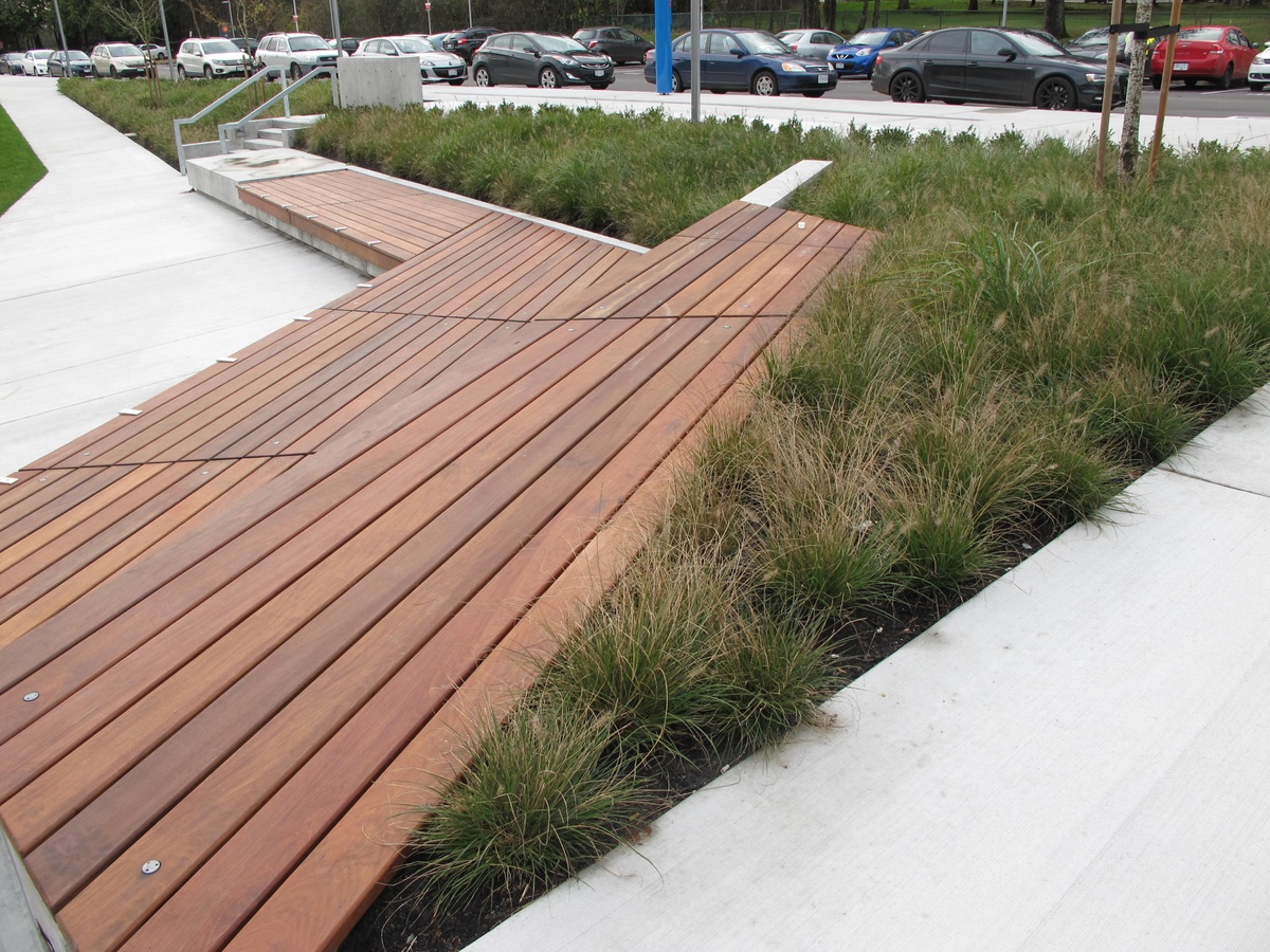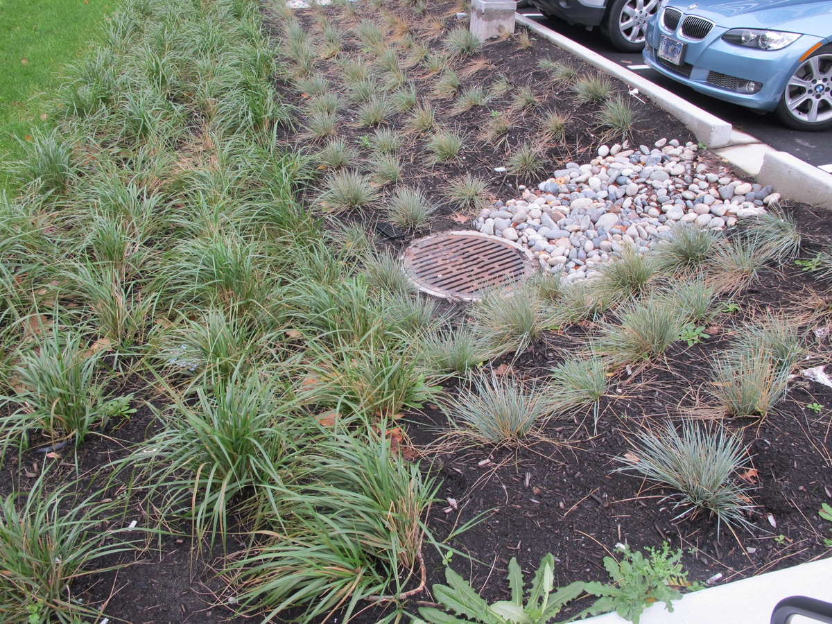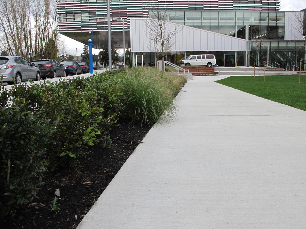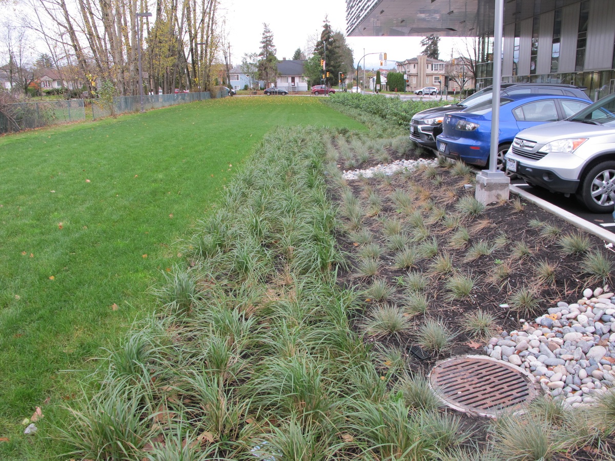 To promote a low-impact landscape plan, native and drought-tolerant plants were selected, including a sod mix of predominantly Fescue and Ryegrass. Fescue grass is a drought-tolerant alternative to traditional Kentucky Bluegrass and precludes the need for an on-site irrigation system. The sod may turn yellow to brown in drought conditions, however, Langara has committed to no irrigation as a way to conserve potable water.