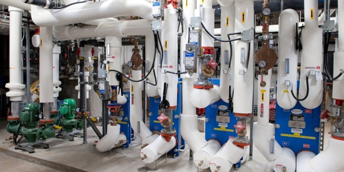 Heat is recovered from lab exhaust fans, washrooms, and non-grease kitchens and injected back into the Thermenex header before the exhaust air leaves the building.