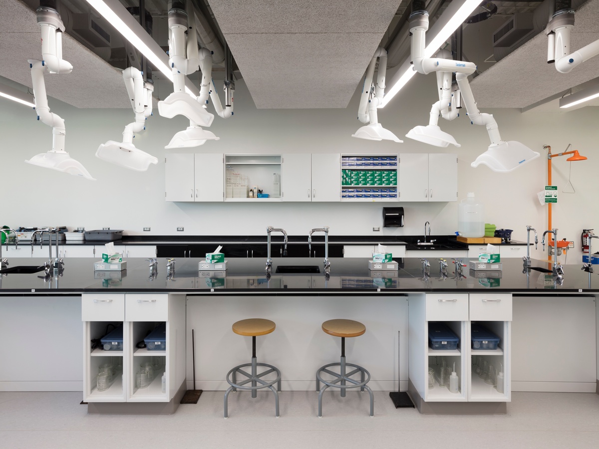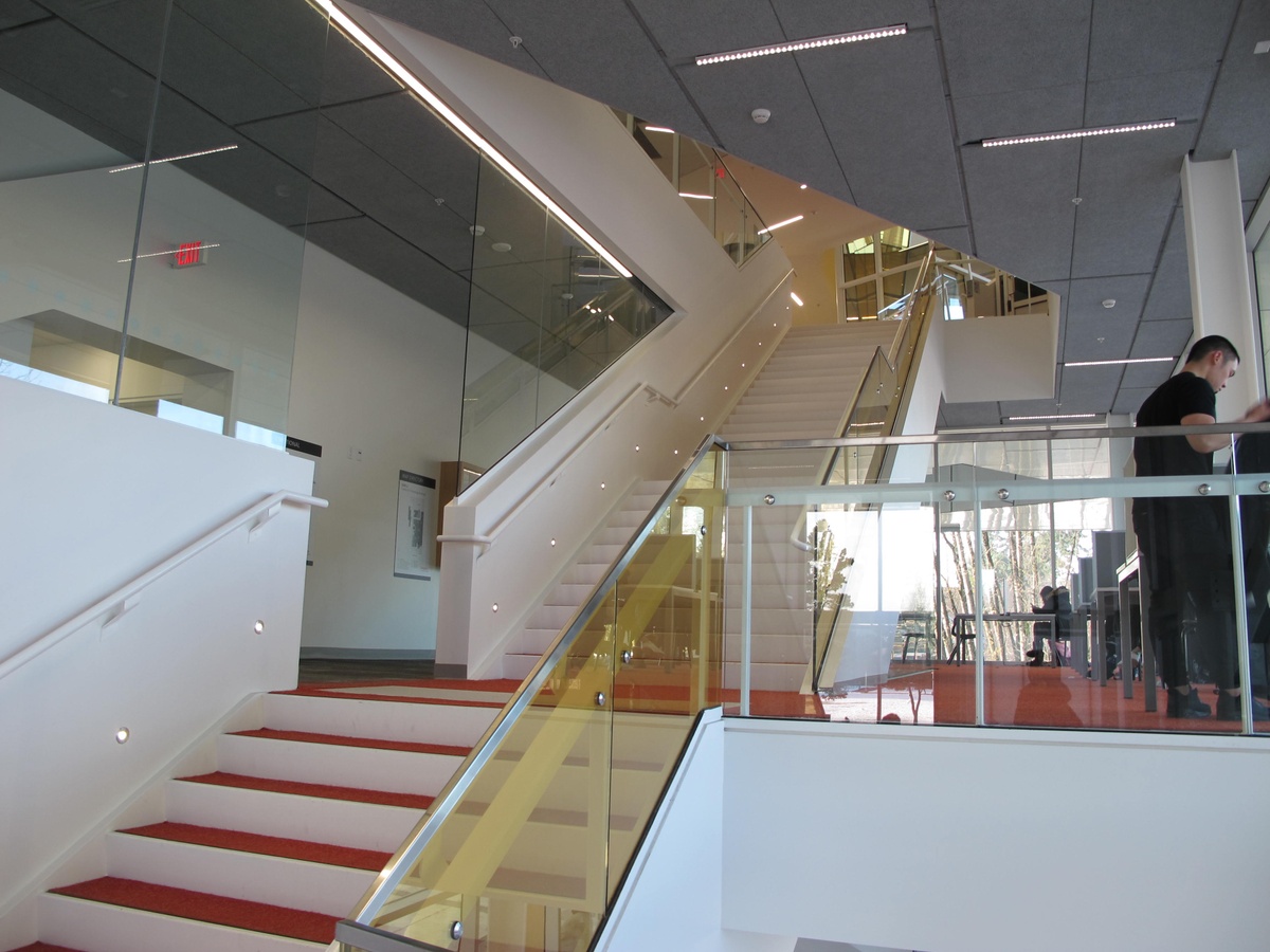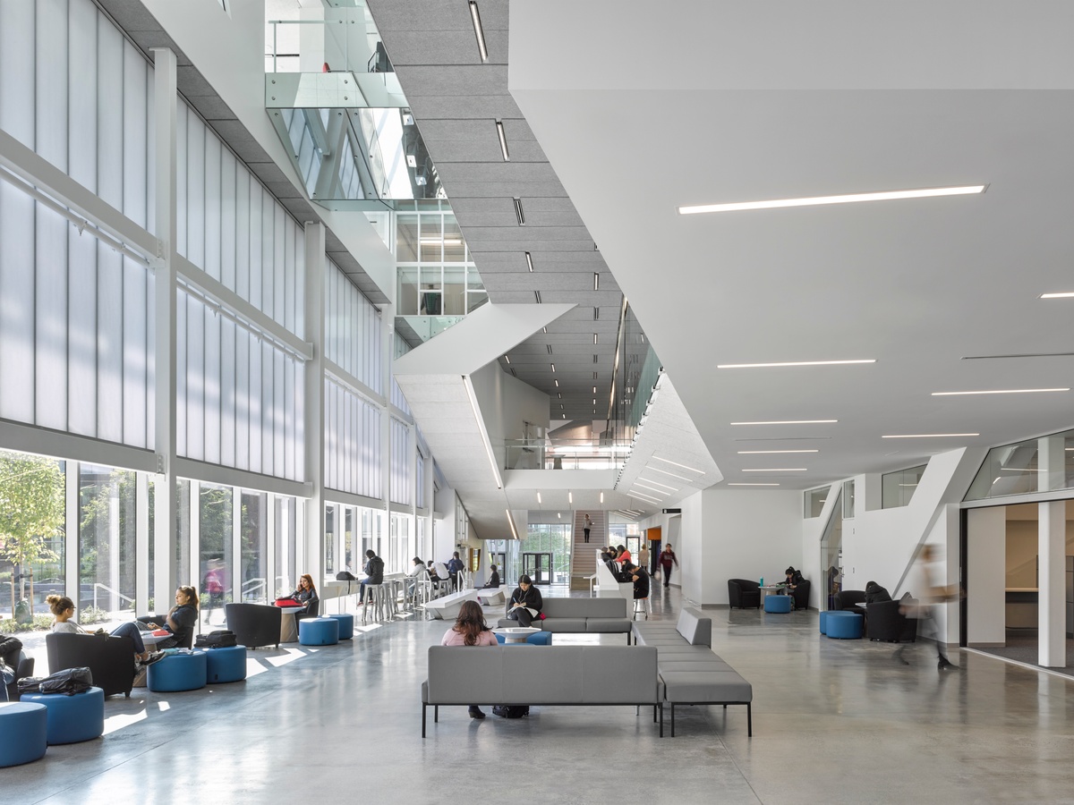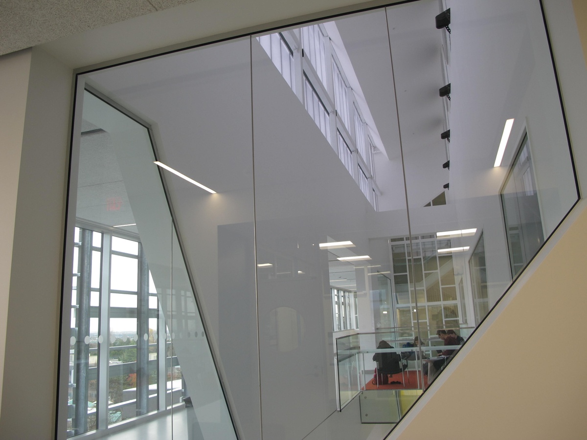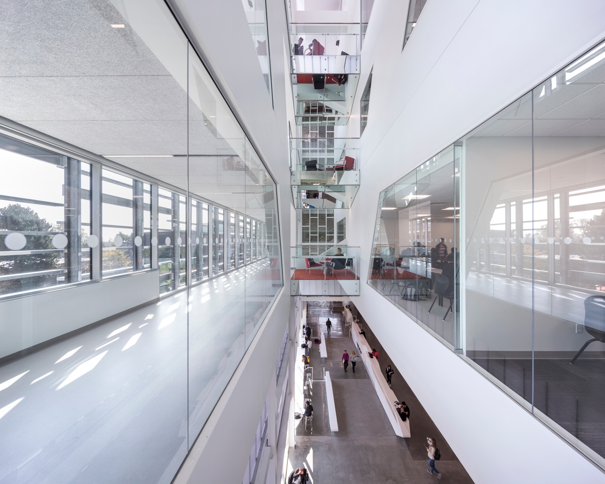 In the interest of creating even further connection with the outdoor environment, the Science & Technology Building was designed to provide occupants with exterior views throughout the majority of the building. Over 90% of the regularly occupied areas of the building have been provided with views, with interior partitions constructed with full height glazing to optimize views for occupants working in non-perimeter spaces.