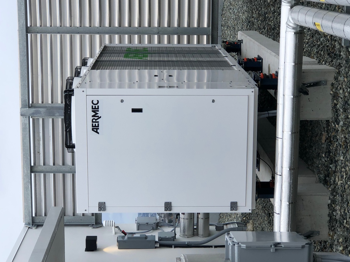- An air source heat pump (ASHP) providing heating, cooling and some DHW heating, at over 200% efficiency. This means that for every watt of energy used, the unit provides on average 2 units of heat to the building. The ASHP can also use waste heat from air conditioning to pre-heat the DHW.