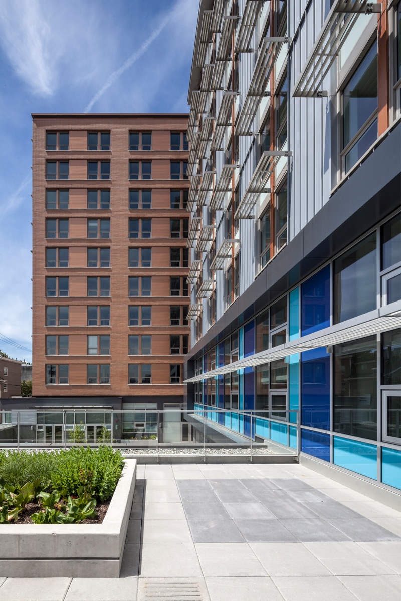 The site was previously home to the Drake Hotel, a small 24-room hotel. Utilizing a previously developed property can be a means of urban revitalization, which prevents the development of green field sites. This project significantly increased on-site density, while situating tenants in an accessible area close to many nearby and walkable amenities. For access to further destinations, the site facilitates easy access to public transportation, as well as secure and accessible bicycle storage for occupants and staff. To make efficient use of site area and prevent a heated microclimate associated with dark surfaces such as asphalt, all of the project’s parking was tucked underground, below t3he building.