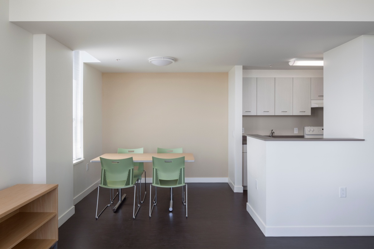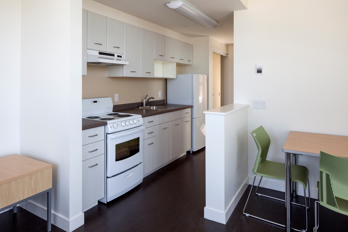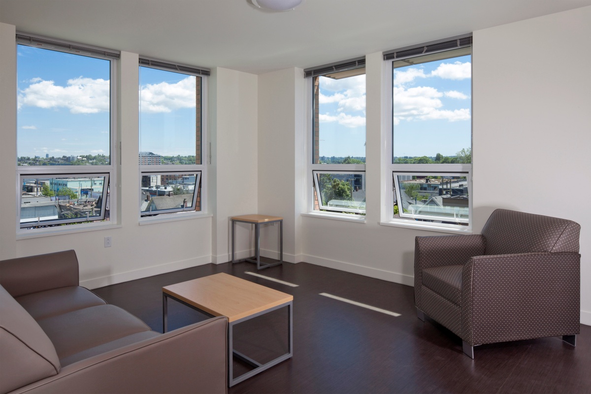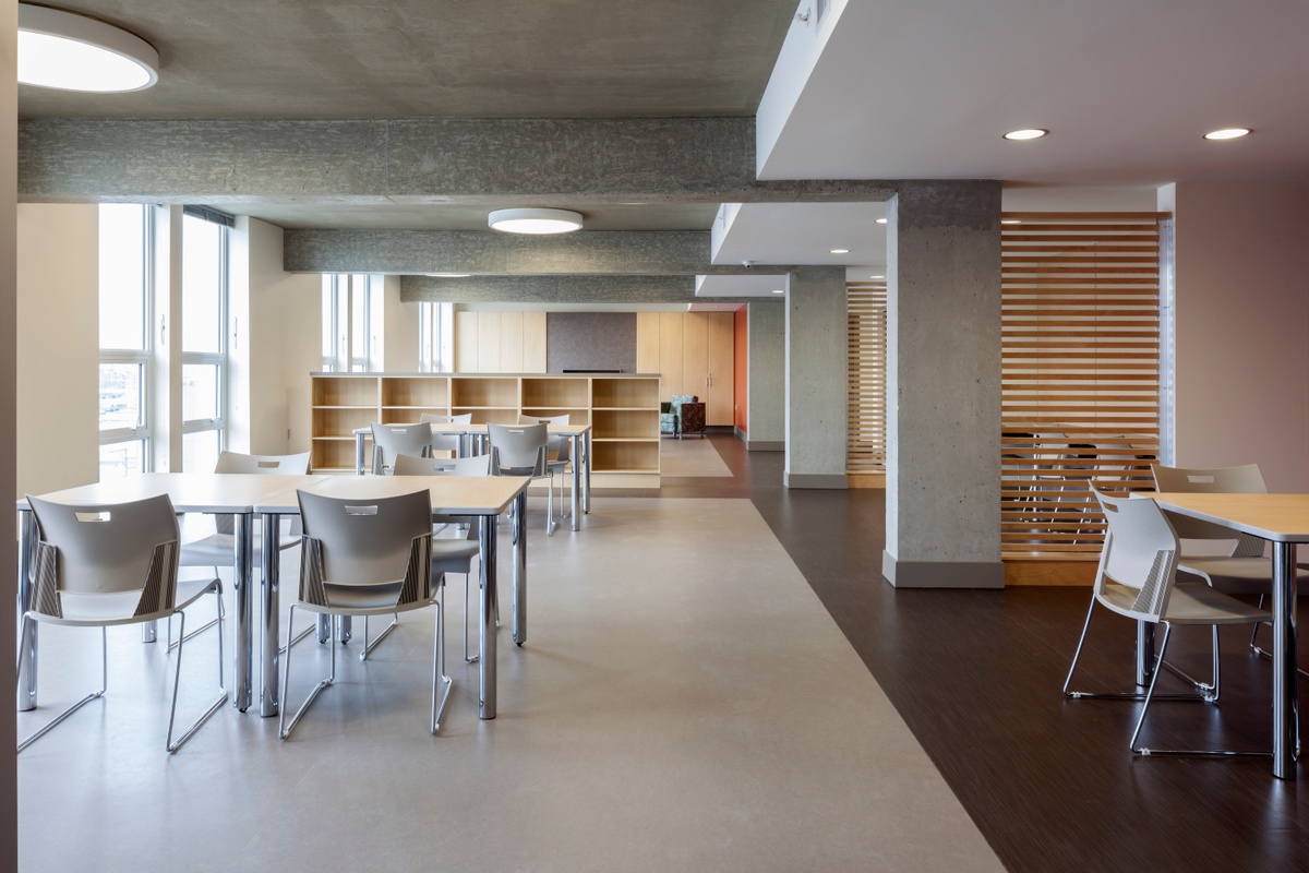 The HVAC system needed to balance energy efficiency with providing the right amount of air for a healthy indoor environment. To achieve this end, the building’s HVAC was equipped with DDCs (direct digital controls). Efficiencies through scheduling via the DDC provide energy savings. Monitoring sensors in the residential suites control temperature as well as monitor CO2 and humidity. These controls are crucial not only for the quality of breathable air in the indoor environment but for residents and staff to be able to adjust conditions for personal comfort.