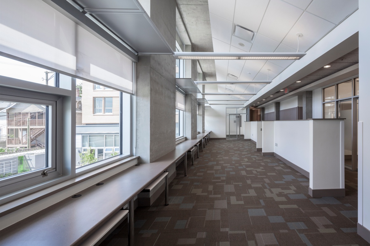 A number of the Budzey Building lighting features were designed with energy efficiency in mind. Lighting control systems were designed in accordance with ASHRAE 90.1-2004 (with addenda/2007 and errata), a standard that includes a maximum indoor lighting power density (LPD). Low voltage lighting controls were used on the project, with dimming on lighting systems. Time clocks, photocells and local switches were incorporated as energy conservation devices also. Daylight sensors were integrated with the overall lighting system design to maximize the building’s energy conservation. Occupancy sensors in storage rooms, common washrooms, amenity area, kitchen, and offices create additional energy savings whenever these spaces are unoccupied.
