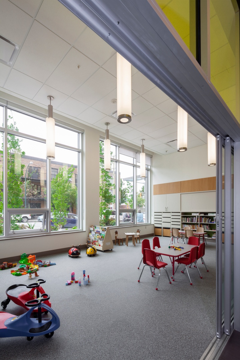 Amenity and support spaces include a dining area, lounges, meeting rooms, washrooms, laundry rooms, and computer access area. Play areas in the building have access to the outdoor areas, which also have equipment storage, furniture, play equipment and raised planting beds. The rooftop is equipped with a garden and raised planting beds.